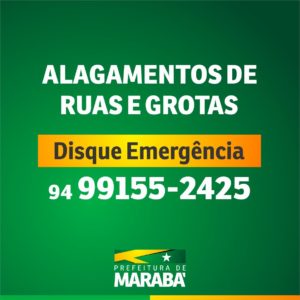 A Prefeitura Municipal de Marabá divulga o número do “Disque Emergência” para casos de alagamentos de ruas, avenidas e grotas.