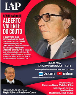 - O Instituto dos Advogados do Pará, a mais antiga instituição jurídica do Estado, fundada em 1925, que deu origem à OAB/PA, promove na próxima quinta-feira live alusiva ao centenário de nascimento do advogado Alberto Valente do Couto, considerado um dos líderes da advocacia criminal do século XX. O evento será coordenado pelo presidente do IAP, o professor e escritor Clóvis da Gama Malcher Filho, que também é membro da Academia Paraense de Letras, da Academia Paraense de Letras Jurídicas, do Instituto dos Advogados do Brasil e do Instituto Paraense de Direito Comercial, além de fundador da Academia Brasileira de Direito.Filho do saudoso homenageado, o advogado, professor e escritor Sérgio Alberto Frazão do Couto, ex-presidente e ex-conselheiro federal da OAB-PA, membro da Academia Paraense de Jornalismo e do Instituto dos Advogados do Brasil, dará depoimento sobre vida e obra de seu pai. Participação especial dos festejados criminalistas Thadeu de Jesus e Silva e Américo Leal.Postado há Yesterday por Franssinete Florenzano0