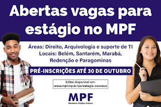 O Ministério Público Federal abriu processo seletivo para estágio em Direito, Arquivologia e suporte técnico em Tecnologia da Informação (TI), em todo o Pará. As pré-inscrições podem ser feitas até esta sexta-feira (30). A bolsa é de R$ 850, mais auxílio-transporte. A jornada é de 20 horas semanais. As provas serão em ambiente virtual. Na área do Direito há vagas para Belém, Santarém, Marabá, Redenção e Paragominas. Na de Arquivologia e suporte técnico de TI as vagas são para a capital. Para fazer a pré-inscrição é preciso acessar este link. Para confirmar a inscrição, até as 23h59 do dia 2 de novembro os candidatos deverão encaminhar por e-mail a documentação exigida no item V do edital.