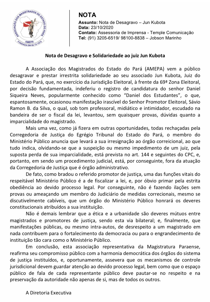 O clima de discórdia na campanha eleitoral está afetando até relações institucionais e pessoais das autoridades que fiscalizam e julgam os políticos. Haja adrenalina! O promotor de justiça Sávio Ramon e o juiz da 69ª Zona Eleitoral, Jun Kubota, de Jacundá, se desentenderam feio. Kubota indeferiu o registro de candidatura de Daniel Siqueira Neves, o “Daniel dos Estudantes”. O representante do MP eleitoral questionou a imparcialidade do magistrado, por entender que existia impedimento ou suspeição, e ameaçou levar o caso à Corregedoria do Tribunal de Justiça. A Associação dos Magistrados do Pará entrou na briga e emitiu nota de desagravo em solidariedade ao juiz. Leiam.