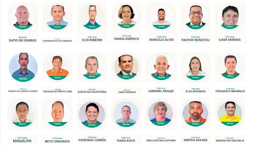 Márcio do São Félix (PSDB), reeleito, foi o vereador mais votado, com 2.814 votos. Dato do Ônibus (PSL), um dos novatos, foi o menos votado, com 763 votos. Candidato a vereador menos votado nessas eleições, Paraíba do Residencial Magalhães (PSDB) teve um voto, muito provavelmente o dele mesmo.