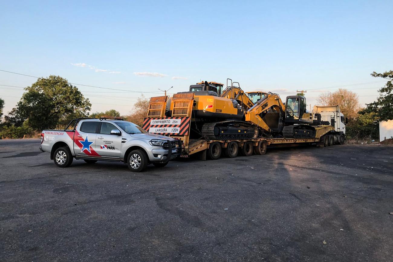 Fiscais de receitas estaduais da Secretaria de Estado da Fazenda, (Sefa) lotados na unidade de controle de mercadorias em trânsito do Araguaia, sudeste do Estado, apreenderam, no dia 27/08/2021, durante fiscalização na entrada da cidade de Conceição do Araguaia, duas máquinas escavadeiras e duas pás carregadeiras, que viajavam com nota fiscal tendo origem em Minas Gerais, com remessa para uma empresa de telefonia celular em Parauapebas, optante do Simples Nacional. A venda havia sido feita para o Maranhão.