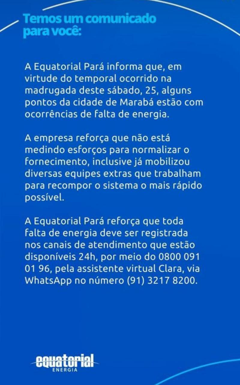 A Equatorial disse, ainda, que toda falta de energia deve ser registrada nos canais de atendimento pelo número 0800 091 01 96; pela assistente virtual Clara, por meio de aplicativo de mensagem instantânea no número (91) 3217-8200.