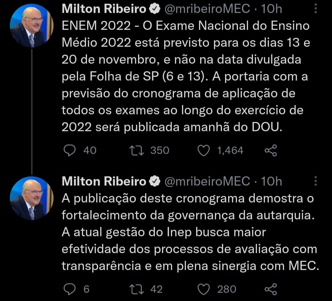 As datas foram anunciadas de acordo com a portaria publicada pelo Instituto Nacional de Estudos e Pesquisas Educacionais Anísio Teixeira (INEP) no DOU. Embora o ministro da educação, Milton Ribeiro, tenha divulgado as datas ontem, 20, pelas redes sociais, é necessário a publicação no DOU para validade prática.