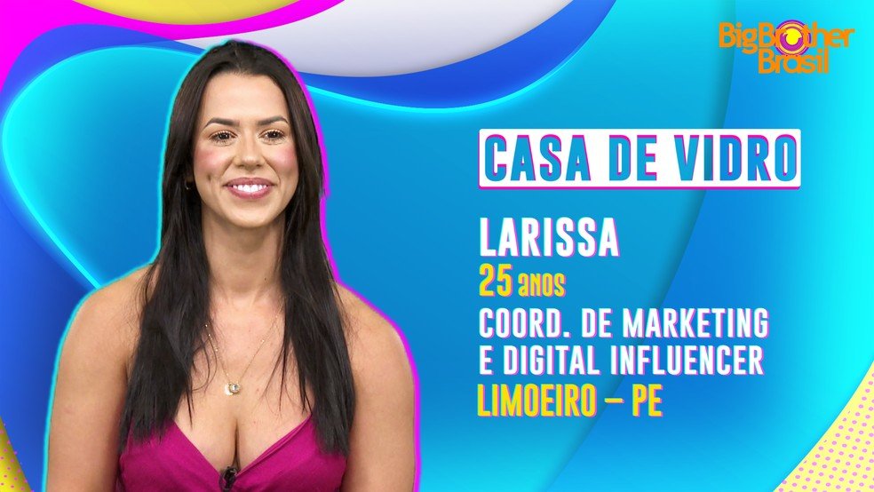 Candidata a participar do ‘BBB22’, a pernambucana Larissa, de 25 anos, é nascida na cidade de Limoeiro, distante 77 quilômetros da capital Recife. Digital Influencer, Larissa participa da Casa de Vidro ao lado de Gustavo com o sonho de lutar por R$ 1,5 milhão e transformar sua vida