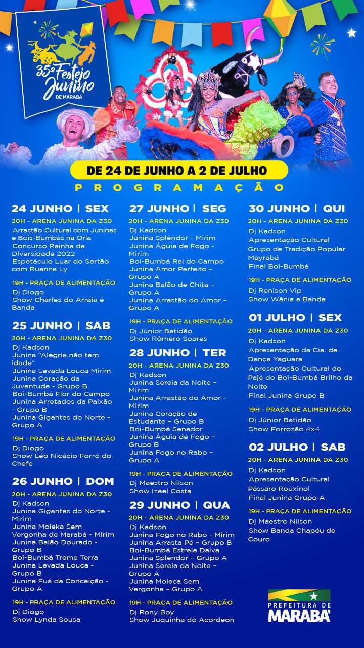 35º FESTEJO JUNINO DE MARABÁ 24.06 2 aguardando Programado para 24 de jun. de 2022 As 22h Transmissão ao vivo da apresentação das Quadrilhas e Bois. Não percam!