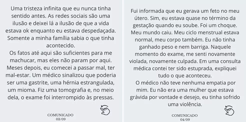 A publicação foi feita na noite deste sábado (25), após o assunto se tornar um dos mais comentados nas redes sociais. “Não posso silenciar ao ver pessoas conspirando e criando versões sobre uma violência repulsiva e um trauma que sofri”, afirma ela. “Esse é o relato mais difícil da minha vida. Pensei que levaria essa dor e esse peso somente comigo.”