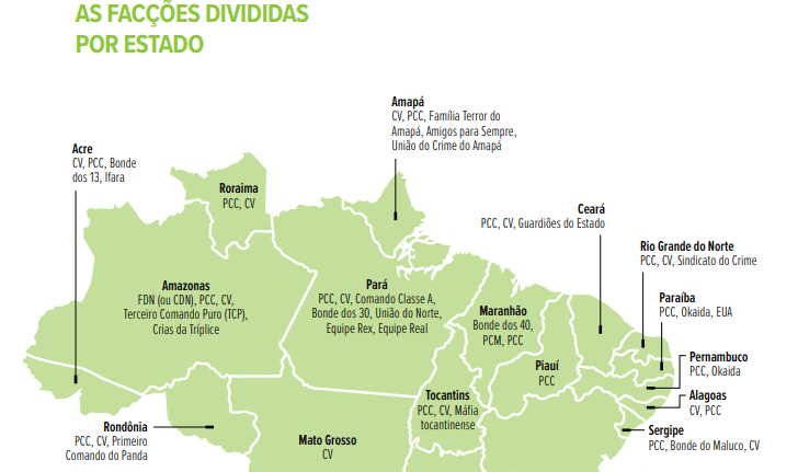 No Pará estão presentes: PCC, CV, Comando Classe A, Bonde dos 30, União do Norte, Equipe Rex, Equipe Real.