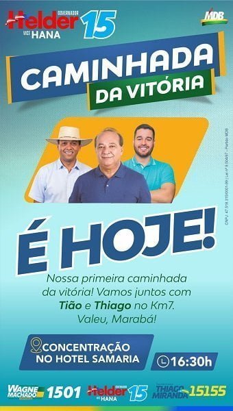 Convido você, sua família e seus amigos para a Primeira Caminhada da Vitória com Tião e Thiago Miranda. Vamos juntos na direção de uma cidade forte e com representatividade atuante na Assembleia Legislativa do Pará e no Congresso Nacional, em Brasília. Todos convidados!