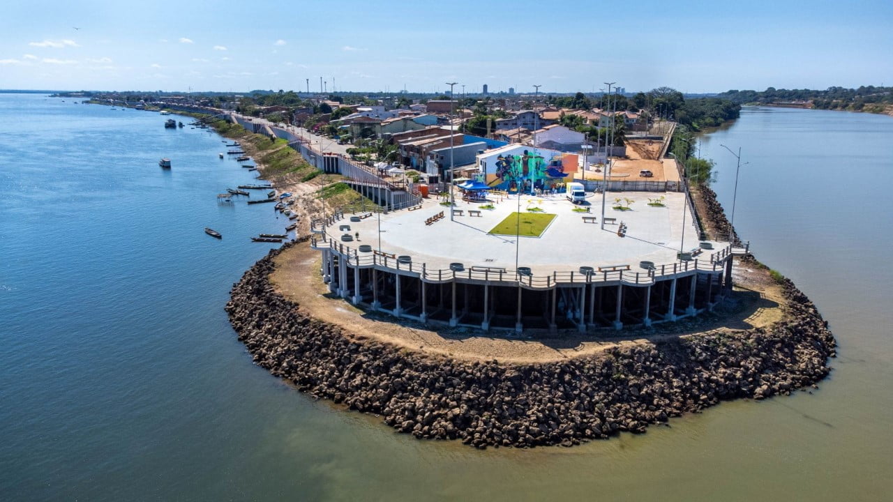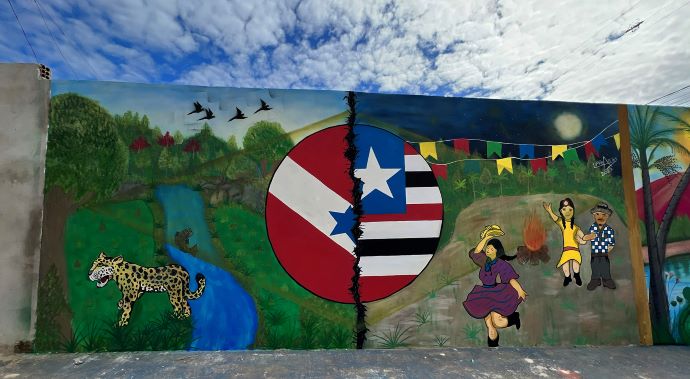 Todos os artistas selecionados receberam ajuda de custo, além de capacitação e acompanhamento realizado pelos artistas André Amparo e Fhero. “Para mim, não são murais, são sonhos que se permitiram ser ilustrados”, comenta Fhero. Murais coletivos Entre os dias 27 a 30 de julho, Bino Sousa, Carla Bianca, Bosco, Franart e Oiram estiveram no Mirante da Orla, um novo ponto de encontro da cidade de Marabá (PA), localizado no bairro Francisco Coelho, conhecido como Cabelo Seco, um dos mais antigos da cidade. No local, marcado pelo encontro dos rios Tocantins e Araguaia, eles construíram uma obra de aproximadamente 150 m². Os artistas trouxeram o desejo de valorizar a cultura local e elementos cotidianos de suas histórias. No mural, o menino negro, que representa as