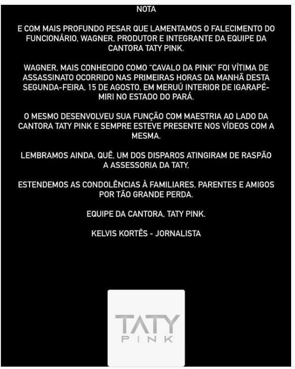 No fim da tarde desta segunda-feira, 15, a equipe da cantora Taty Pink emitiu, nas redes sociais, uma nota de pesar lamentando o assassinato de Wagner Freitas, produtor da artista no início da manhã de hoje, durante uma apresentação em Vila do Meruú, em Igarapé-Miri, no nordeste do Pará. Além do rapaz, a assessora da cantora de arrocha foi atingida de raspão na ação.