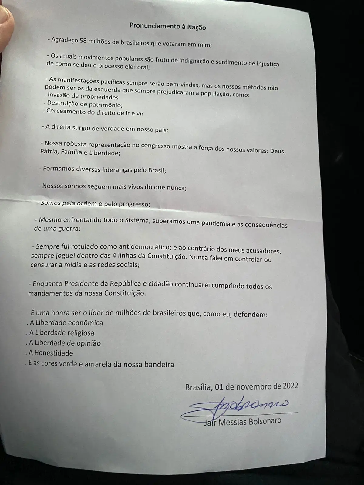 O pronunciamento do presidente Jair Bolsonaro foi um dos momentos mais aguardados por eleitores e manifestantes bolsonaristas. Na tarde da última terça-feira (1º), ele se manifestou pela primeira vez sobre a derrota do último domingo (30), no segundo turno das eleições.