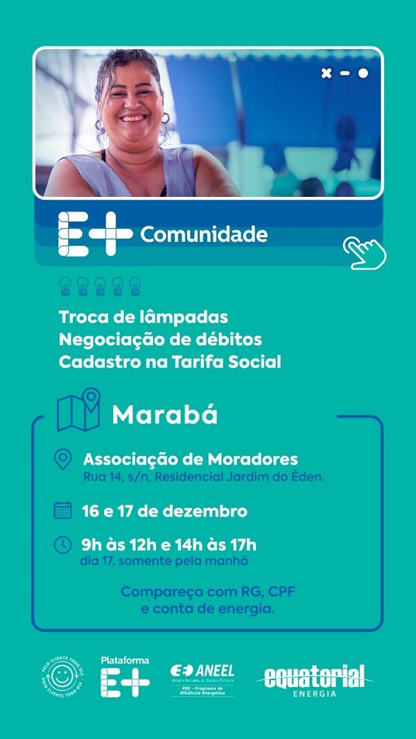 De acordo com a Coordenadora do E+ Comunidade da Equatorial Pará, Elitania Almeida, as ações são uma forma de continuar oferecendo os serviços mais procurados pelos clientes, de um jeito mais próximo. “O cadastro na Tarifa Social, por exemplo, é um dos serviços mais procurados, pois, ele concede às famílias um desconto de até 65% na conta de luz, o que gera uma grande economia no fim do mês”, destaca.