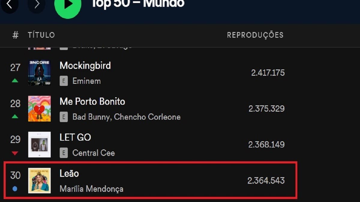 Marília Mendonça segue sendo uma das cantoras mais relevantes do Brasil. Mesmo após mais de 1 ano de sua morte, a sertaneja continua atingindo marcas importantes no universo musical. A prova disso é que neste sábado (28.01), sua música “Leão” entrou na lista Global do Spotify, ocupando a 30ª posição entre as músicas mais ouvidas no mundo.