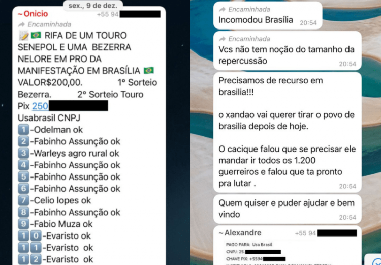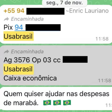 No dia 7 de novembro – pouco mais de uma semana após o segundo turno das eleições -, o empresário encaminhou em um grupo de WhatsApp o número de Pix da USA Brasil para “quem quiser ajudar nas despesas de Marabá” – onde fica o 52º Batalhão de Infantaria de Selva, um dos principais pontos de protestos no Pará.