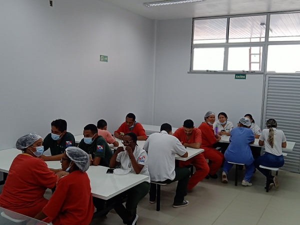 Além da cozinha, o hospital também ganhou um novo refeitório, com capacidade para acomodar cerca de 35 pessoas. Amplo e climatizado, o ambiente é mais confortável e acolhedor para a realização das refeições.