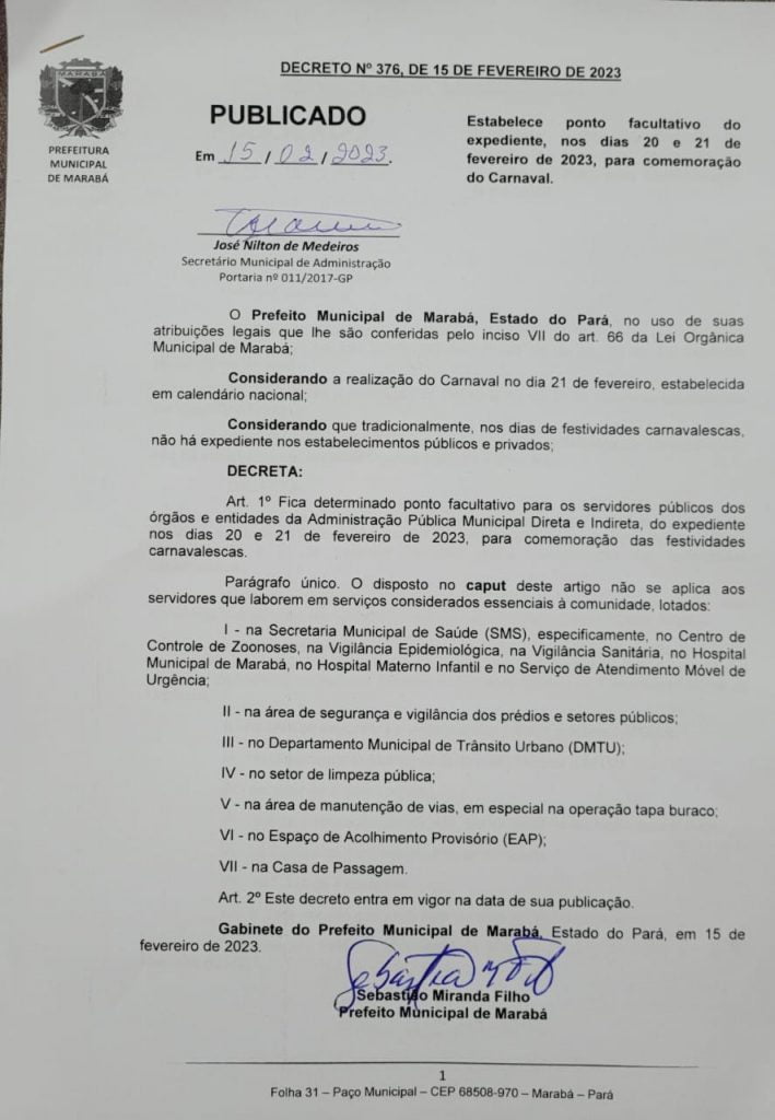 A Prefeitura de Marabá informa que nos dias 20 e 21 de fevereiro haverá ponto facultativo para os servidores públicos dos órgãos e entidades da Administração Pública Municipal Direta e Indireta, em razão das festividades do Carnaval 2023 dentro do calendário nacional.