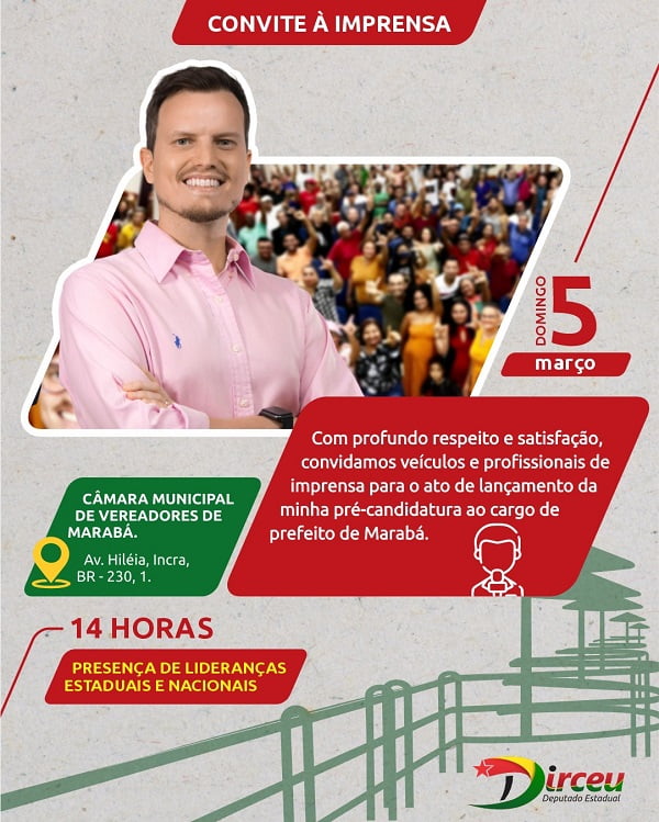 Participe do lançamento do pré-candidato DIRCEU, neste domingo, dia 5 de março, as 14h00, na Câmara Municipal de Marabá.