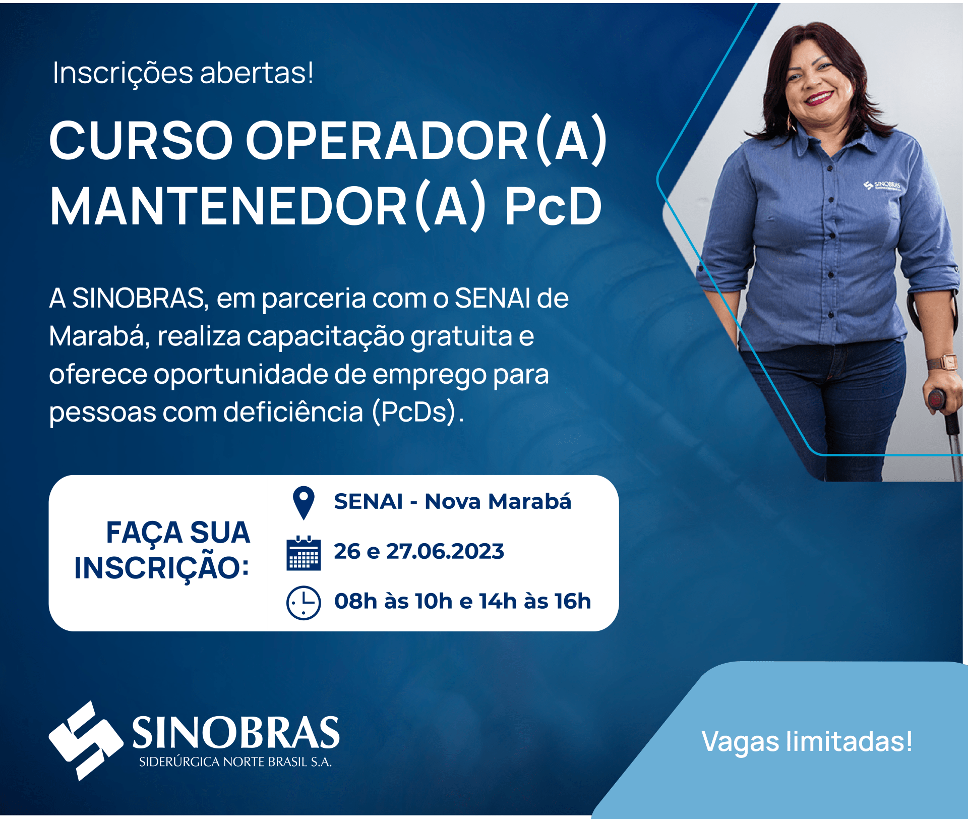 A SINOBRAS vem contribuindo com o desenvolvimento do estado do Pará há mais de 15 anos, com respeito ao meio ambiente e, principalmente, às pessoas. A mais nova iniciativa do Grupo Aço Cearense, do qual a siderúrgica faz parte, é o projeto Crescer, que disponibiliza treinamento de formação para a população local. Dessa vez, a SINOBRAS abre processo seletivo para 25 Pessoas com Deficiência (PcDs) participarem do curso de Operador(a) Mantenedor(a). A iniciativa é totalmente gratuita e voltada para pessoas da comunidade de Marabá que tenham acima de 18 anos. Os candidatos que passarem por todas as fases do processo seletivo terão a oportunidade de se capacitar e fazer parte do quadro de colaboradores da SINOBRAS.