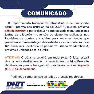 A seguir, a nota do Departamento Nacional de Infraestrutura de Transporte: