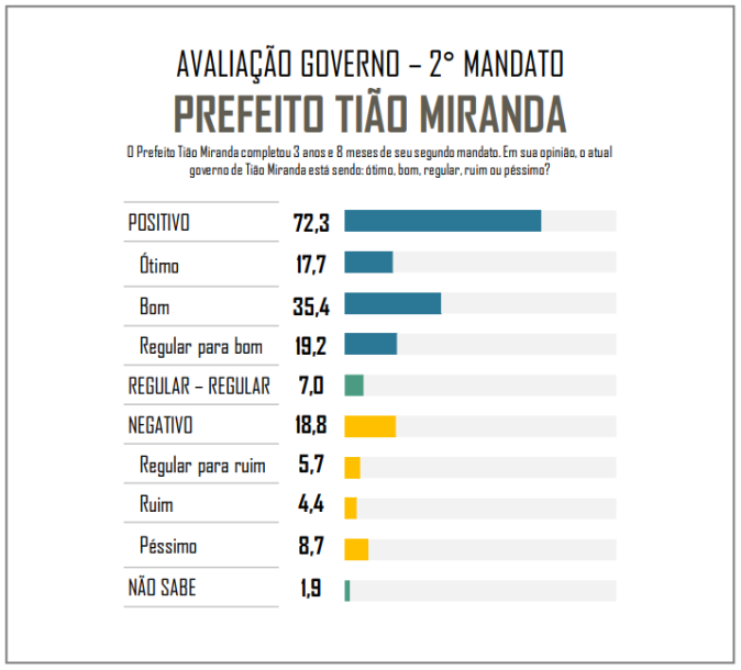 A pesquisa também sondou a opinião dos entrevistados acerca do segundo mandado do prefeito Tião Miranda e 72,3% avaliaram como positivo; 17,7% disseram que é ótimo; 35,4% consideram bom; 19,2% acham que é de regular para bom. Para 18,8%, é negativo; 5,7% disseram que é de regular para ruim; 4,4% afirmaram que é ruim; 8,7% responderam “péssimo”. 1,9% não soube avaliar.