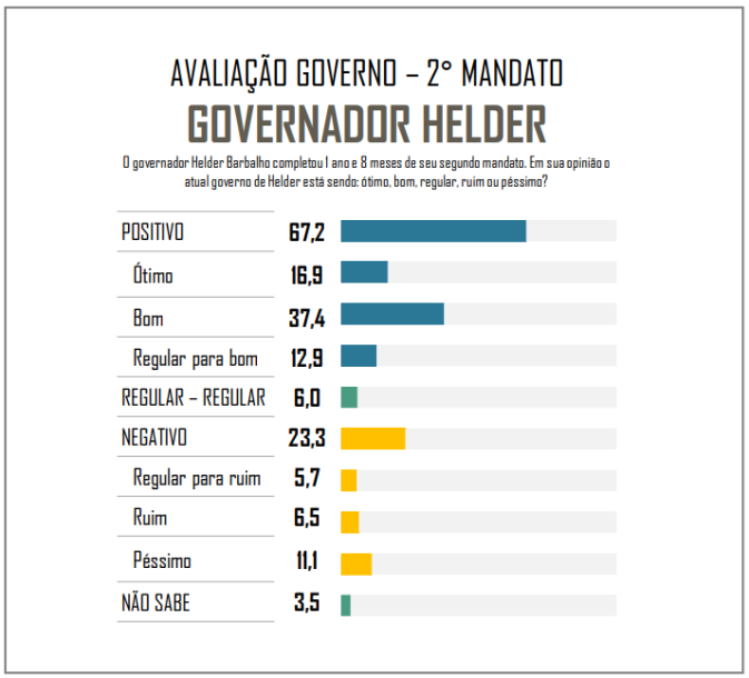 Quanto ao seguundo governo de Helder Barbalho, a avaliação foi a seguinte: 67,2% positivo, 16,9% ótimo, 37,4% bom, 12,9% regular para bom, 6% regular, 23,3% negativo; 5,7% regular para ruim; 6,5% ruim, 11,1% péssimo; e 3,5% não têm opinião.