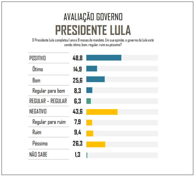 Em relação ao terceiro mandado do presidente Lula, as respostas foram: 48,8% positivo; 14,9% ótimo; 25,6% bom; 8,3% regular para bom; 6,3% regular; 43,6% negativo; 7,9% regular para ruim; 9,4% ruim; 26,3% péssimo; e 1,3% disse não saber.