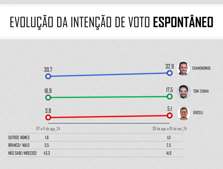 Na estimulada, Chamonzinho aparece com 52,1% da preferência, seguido de Toni (26,2%) e Dirceu (9,8%). Brancos ou nulos, 4,6,% e indecisos, 7,3%. Na espontânea, Chamonzinho aparece com 32,9%. Depois vêm: Toni, com 17,5%, e Dirceu, 5,1%. Outros nomes, 1%, brancos e nulos, 2,5%, e indecisos, 41%.