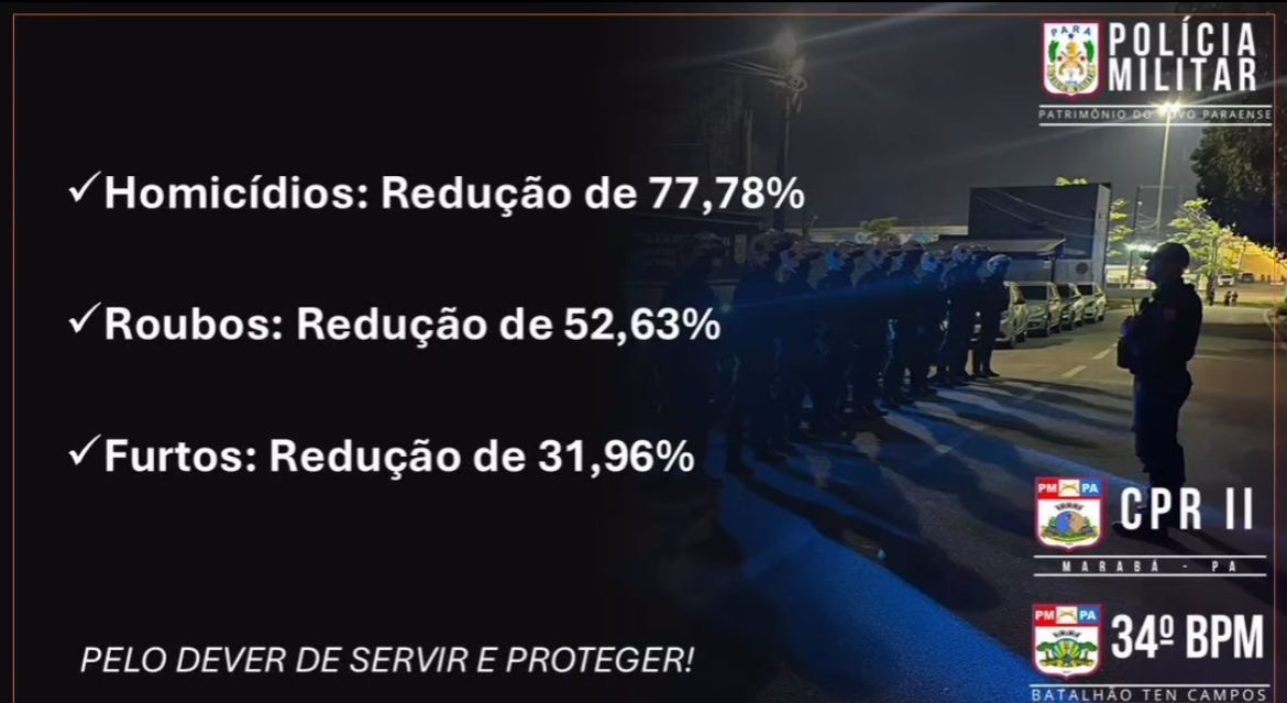 Os resultados positivos são atribuídos ao esforço conjunto dos policiais militares e ao planejamento estratégico adotado pelo 34º BPM, que inclui patrulhamentos preventivos, operações integradas e ações de inteligência policial. Com sede na Rodovia Transamazônica, no Núcleo Cidade Nova, o o 34º Batalhão desempenha papel fundamental no combate à violência e na promoção da segurança em Marabá.