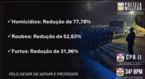 Em comparação ao mesmo período de 2023, a cidade registrou uma redução de 77,78% nos casos de homicídios, 52,63% nos registros de roubos e 31,96% nos furtos. Os números refletem o comprometimento das forças de segurança em garantir a ordem e a tranquilidade da população local.