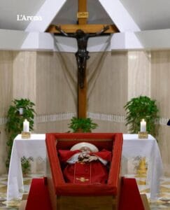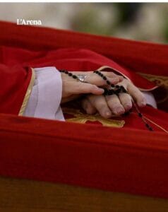 O Papa Francisco, falecido ontem 21 de Abril, Segunda-feira do Anjo, foi colocado no caixão na Capela de Santa Marta, com um rosário entre as mãos. Como esperado, está vestido com a casula vermelha, o pálio e, na cabeça, a mitra branca.
