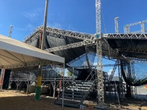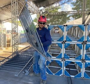 “Começamos a montar na segunda, mas não foi só o palco, a gente já adiantou outras coisas. A questão do camarote do lado esquerdo do palco já está montada a cobertura, falta montar só o piso dele. A gente está contando três dias e concluindo todas essas montagens, o palco, essa cobertura e mais algumas outras coisas. A gente está empenhado, trabalhando, pega cedo e para meia-noite, nessa correria para a gente montar no prazo previsto. Eu creio que no sábado a gente já está só com os ajustes finais”, frisa o encarregado.
