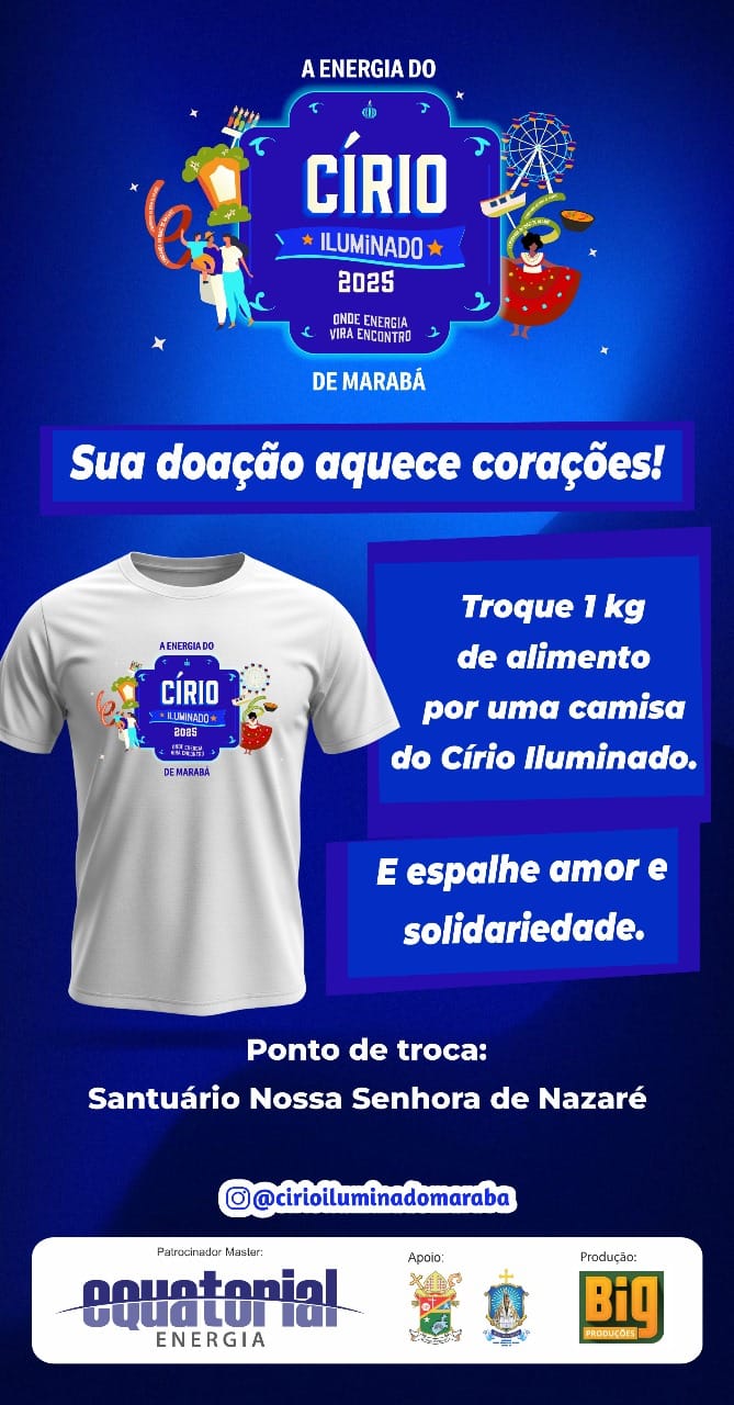 O Círio de Nossa Senhora de Nazaré de Marabá, um dos momentos mais importantes do calendário religioso e cultural da região, está sendo marcado em 2025 por ações de forte apelo à solidariedade. Um movimento inédito, promovido pelo projeto “A Energia do Círio Iluminado de Marabá”, busca mobilizar fiéis e a população em geral para a doação de alimentos não perecíveis. Em troca, as pessoas levam camisas do projeto.