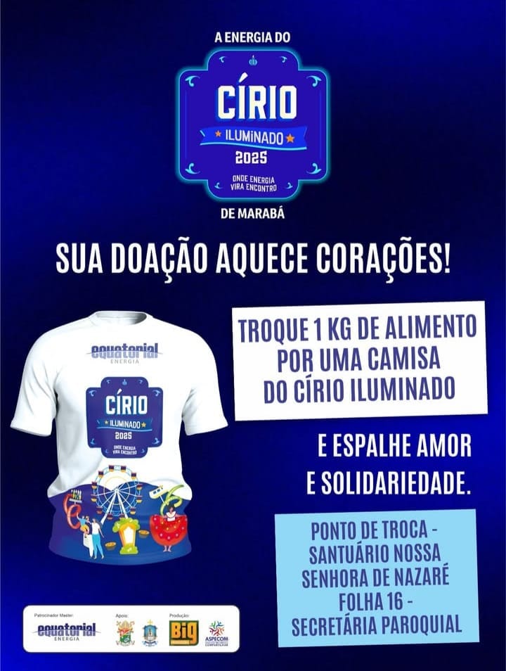 O projeto “A energia do Círio Iluminado de Marabá”, que recebe patrocínio da Equatorial Pará, através da Lei Semear, iniciou na semana do Círio uma ação especial que une fé, solidariedade e amor ao próximo. Quem quiser ter uma camisa oficial do Círio Iluminado poderá trocar por 1 kg de alimento não perecível até a próxima sexta-feira, 17 de outubro, das 8h às 12h e das 14h às 18h. O ponto de troca e doações é o Santuário Nossa Senhora de Nazaré, da Nova Marabá, na Folha 16.