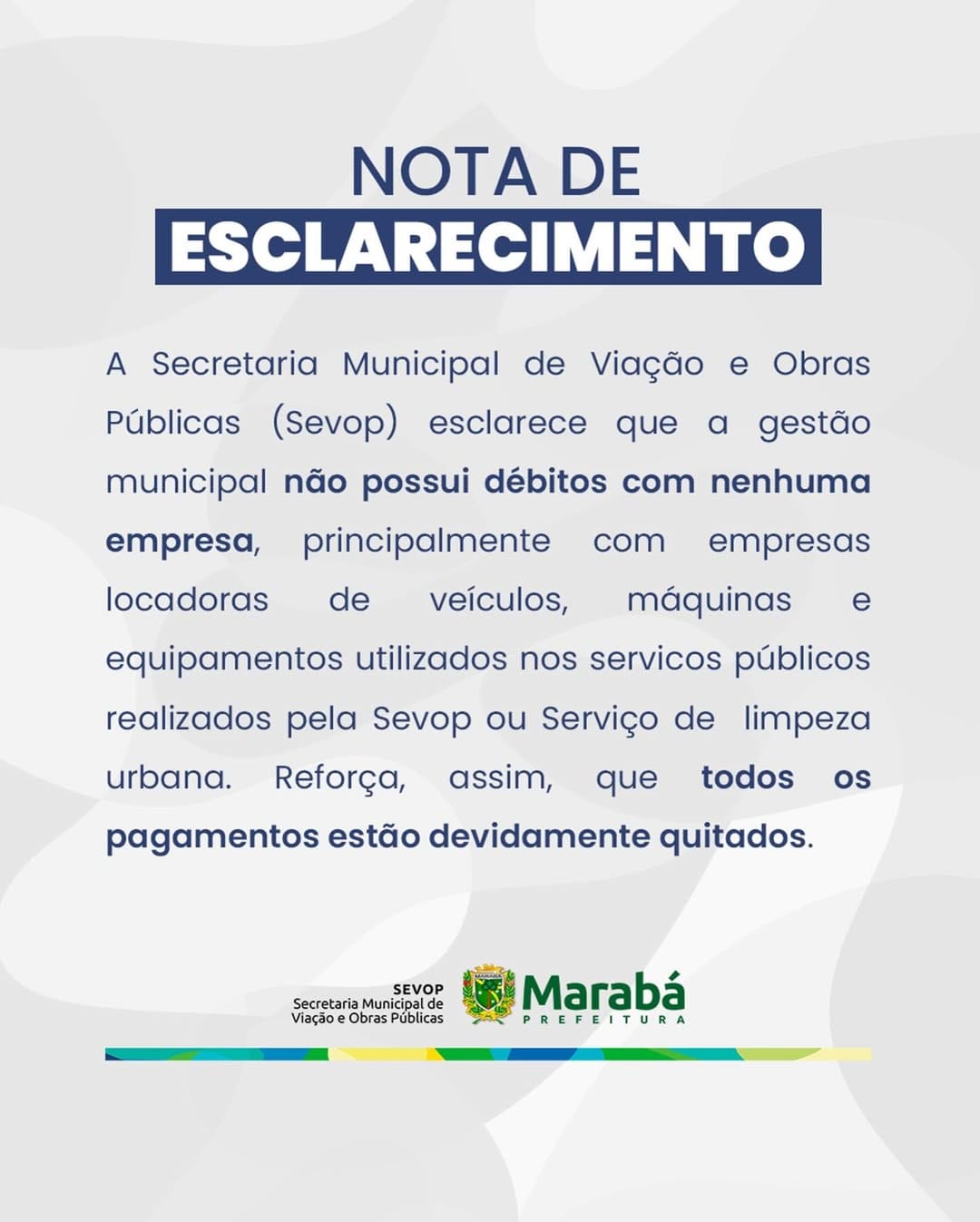 A Secretaria Municipal de Viação e Obras Públicas (Sevop) emitiu um comunicado para esclarecer que a gestão municipal não possui débitos com nenhuma empresa, especialmente com aquelas que locam veículos, máquinas e equipamentos utilizados em serviços públicos realizados pela Sevop ou pelo Serviço de Limpeza Urbana.